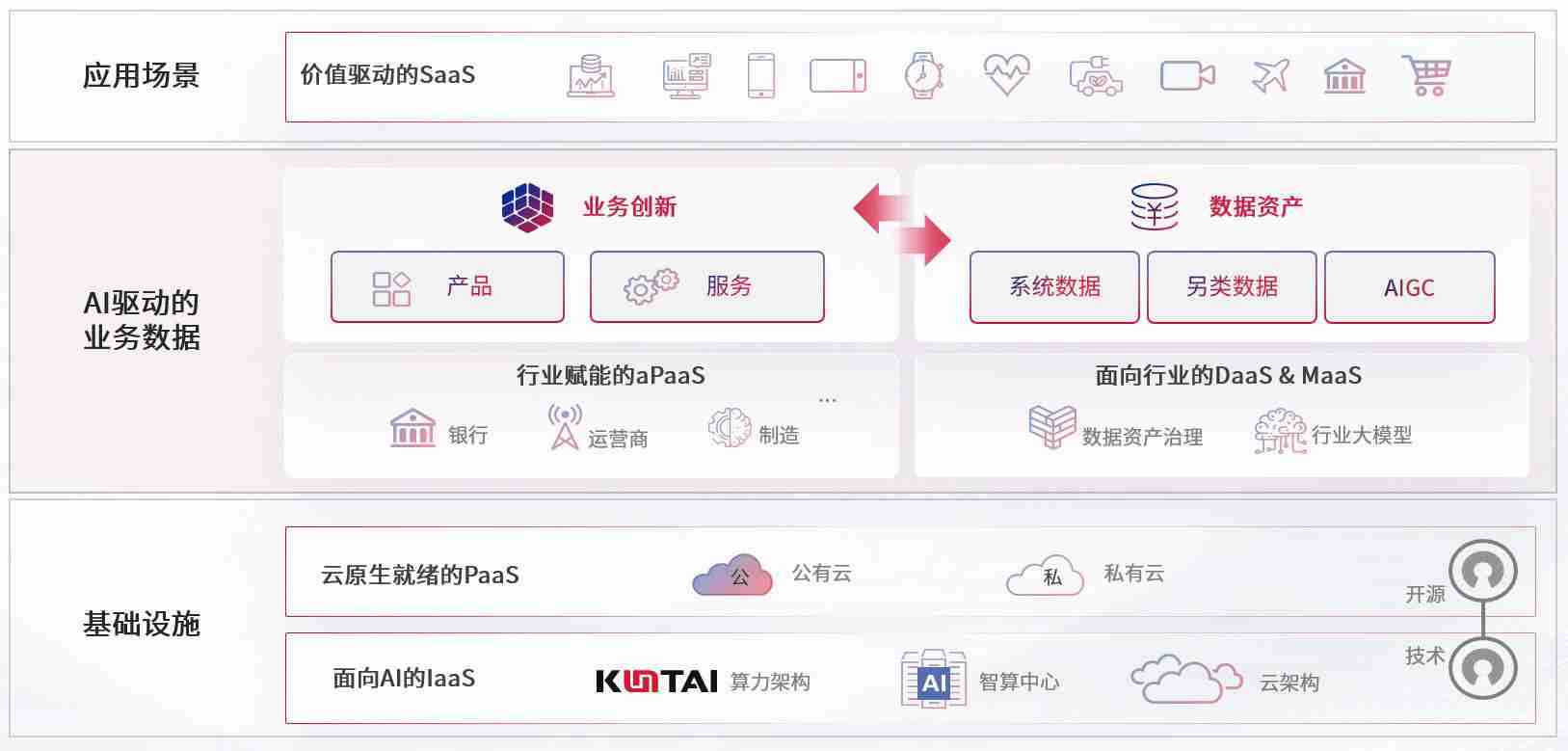数字时代,,,,围绕企业数字化转型的关键要素,,尊龙z6数码开创性的提出数云融合战略和技术体系框架,,着力在云原生、、、数字原生、、、、AI原生和信创产业上架构产品和服务能力,,为处在不同数字化转型阶段的快消零售、、、汽车、、、金融、、、医疗、、、、政企、、、教育、、、、运营商等行业客户提供泛在的敏捷IT能力和融合的数据驱动能力,,构建跨界融合创新的数字业务场景和新业务模式,,助力企业级客户建立面向未来的核心能力和竞争优势,,,全面推动社会的数字化、、、、智能化转型升级。。。。