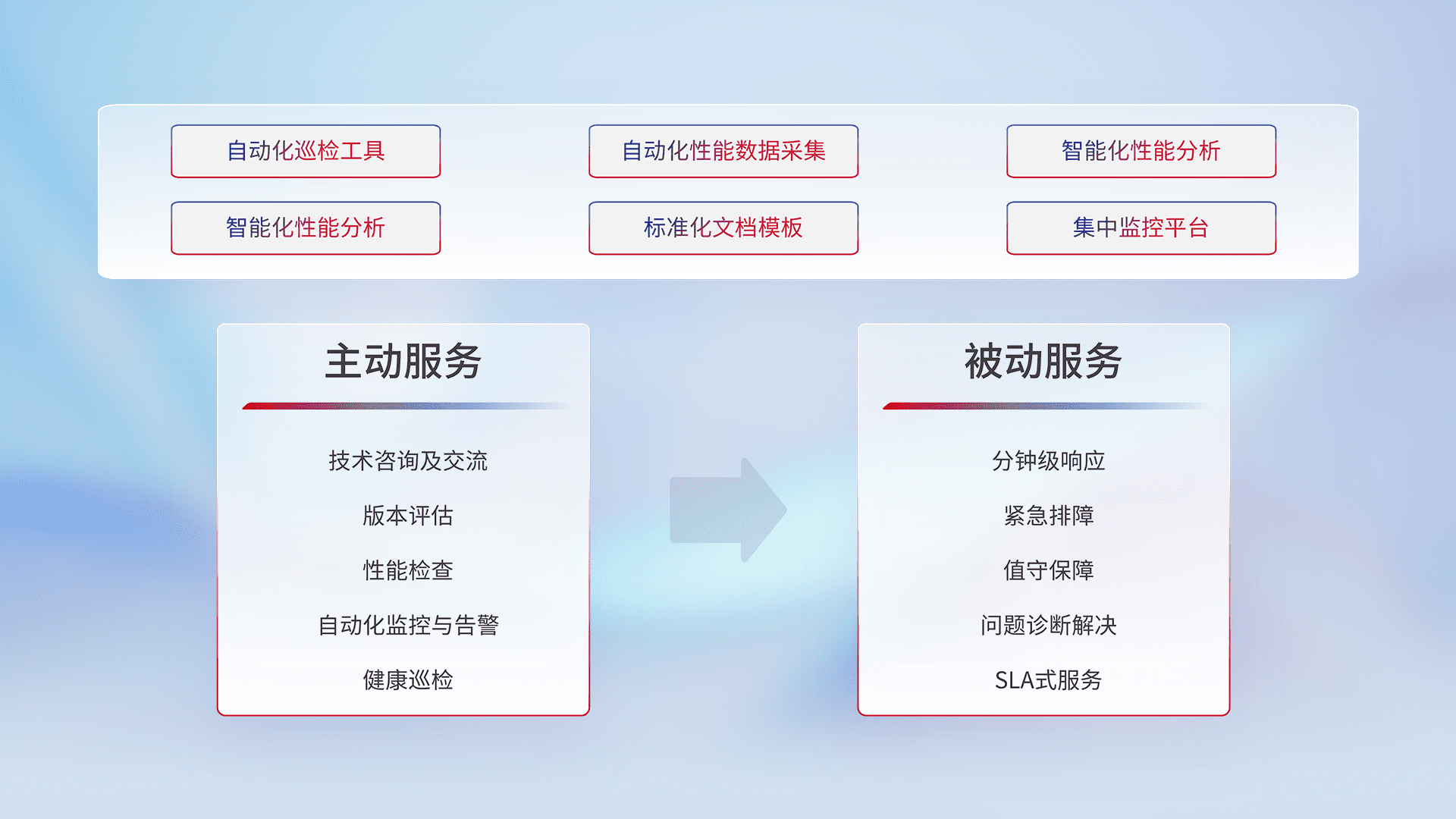 智能化工具和标准化文档,,保障服务质量,,,提供主动服务(包含技术咨询、、、、版本评估、、、、性能检查、、、自动化监控与告警、、健康巡检)和被动服务包含(分钟级响应、、、紧急排障、、、、值守保障、、、问题诊断解决、、、SLA服务)。。。